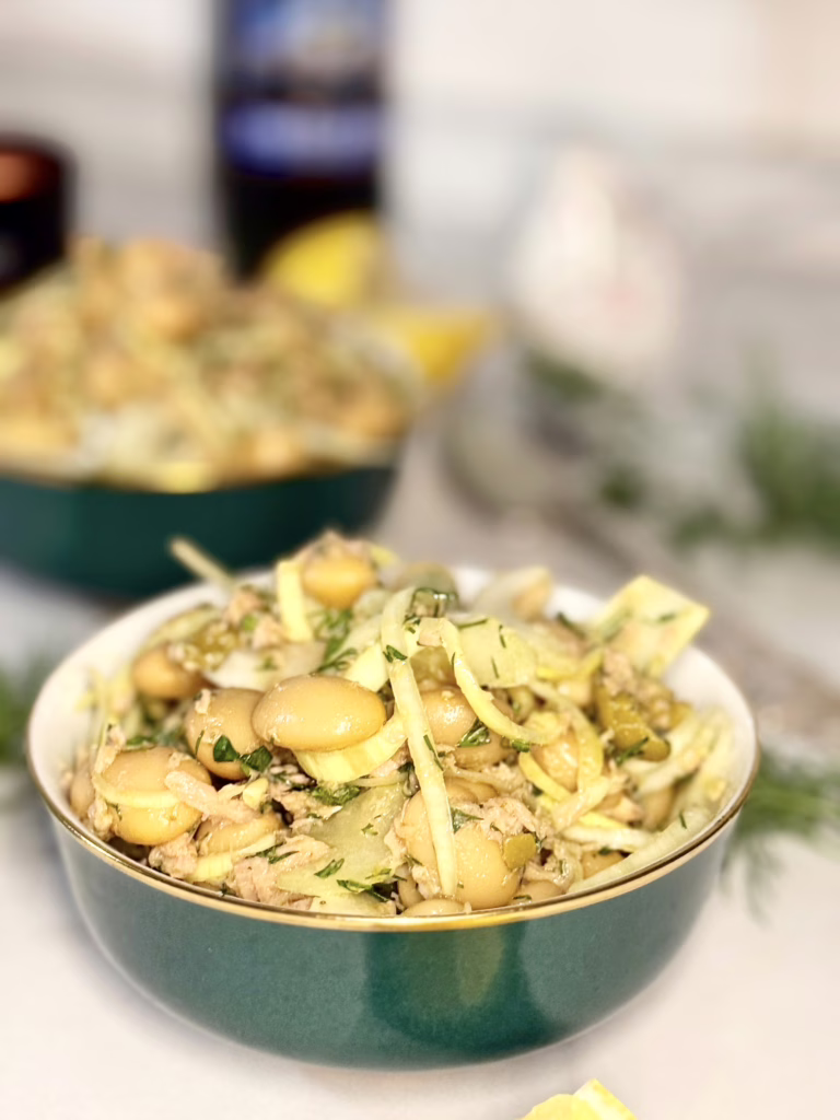 Глянцевий, свіжий та збалансований салат з тунцем та білою квасолею. Це мій надійний рецепт, коли хочеться чистого, виразного смаку та комфортного насичення без жодних термічних процесів.